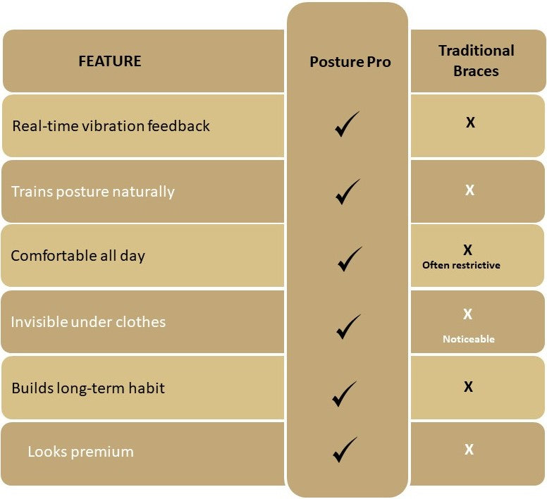 Traditional posture braces pull your shoulders back — uncomfortable, visible, and not designed to train your muscles. Posture Pro works differently. It trains your body. Every gentle vibration cue helps your muscles naturally remember the correct position, building real alignment over time.